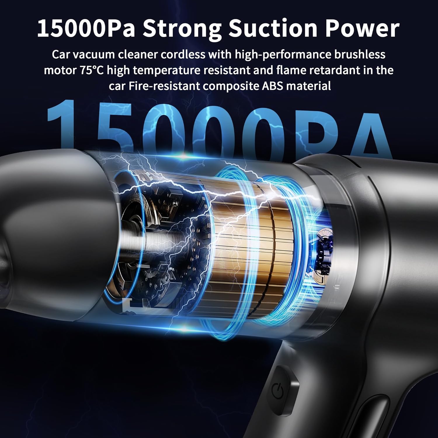 Answer 2: It boasts a robust suction power of 15000Pa, made possible by its advanced brushless motor. You can easily switch between two suction levels to adapt to different cleaning needs, whether you’re doing light dusting or tackling more stubborn spills.